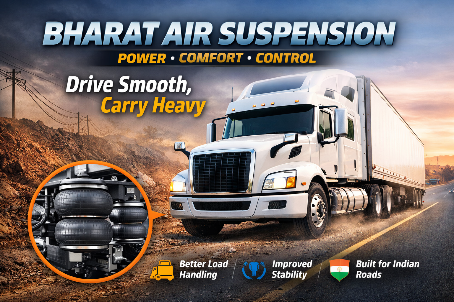 Heavy load? No problem. Bharat Air Suspension ensures balanced weight distribution, reducing stress on the vehicle.